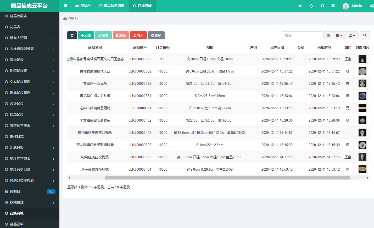 商城模块-商品管理:采集艺术品商品信息,上架管理,支持手机端客户端展示推广